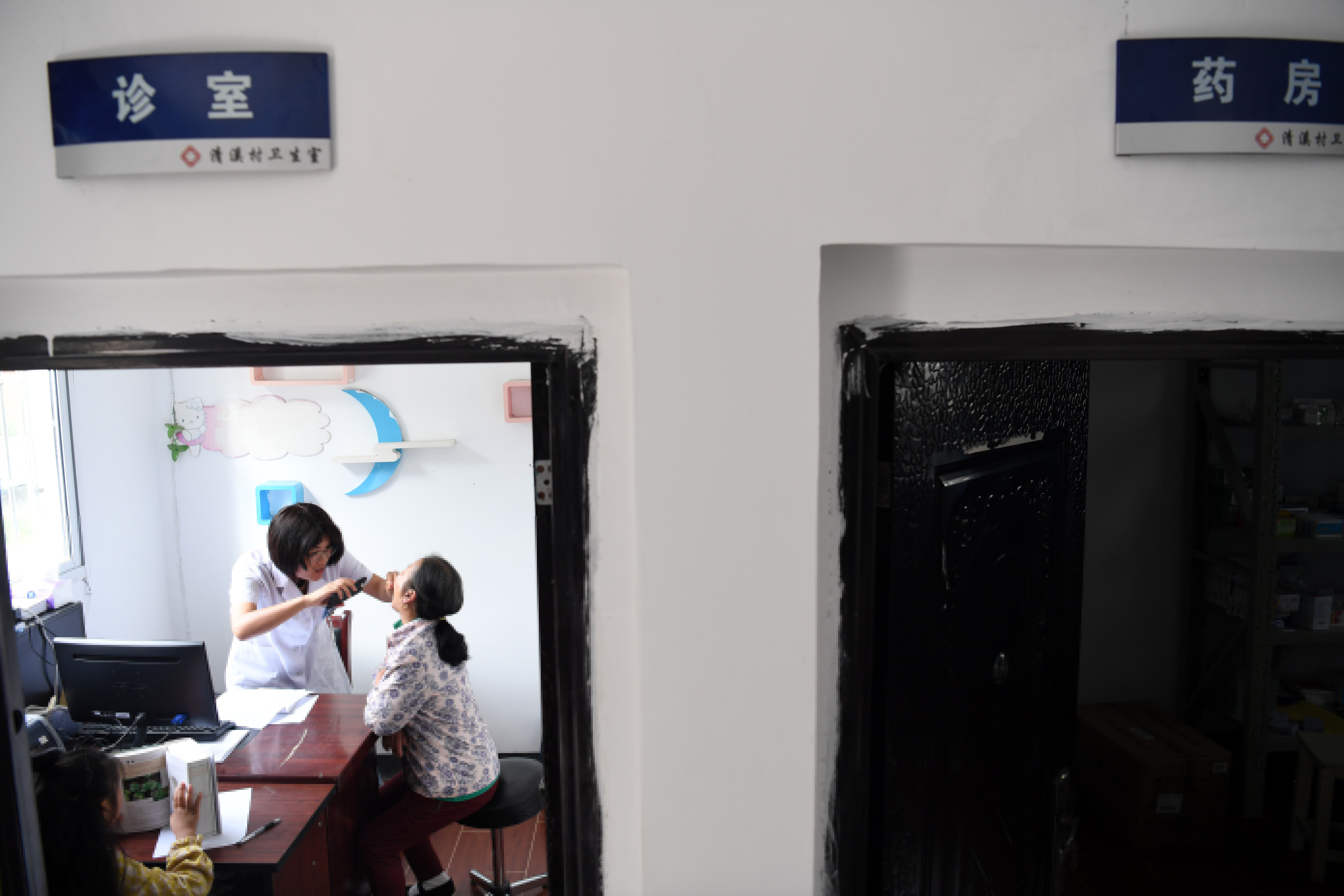 Zhang Qingyu looks on as her parents, Zhang Jianming and Xu Xiaochan, provide medical service for a villager in Qingxi Village, Huangjian Township of east China's Anhui Province, Aug. 31, 2019.(Xinhua/Liu Junxi)