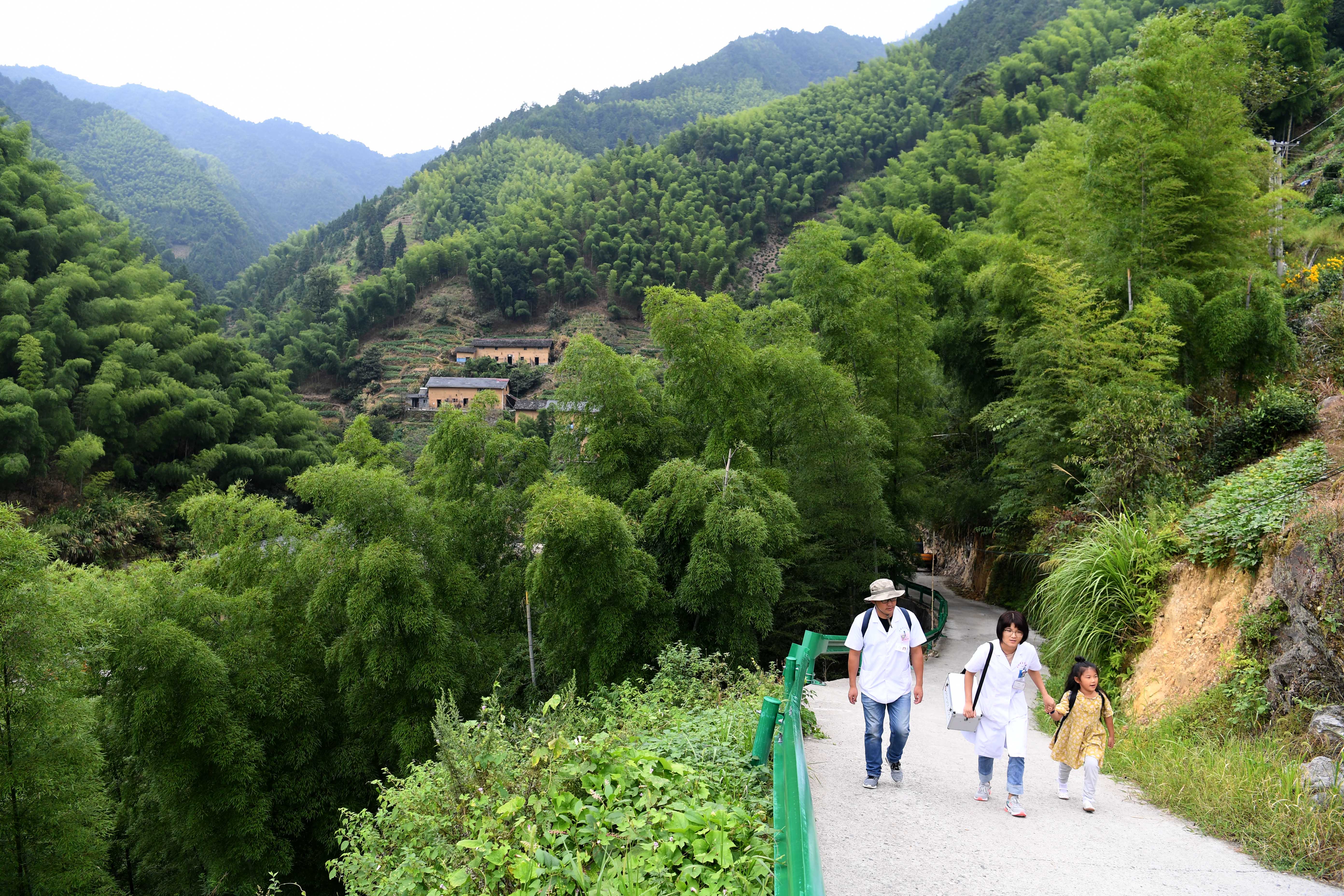 Zhang Qingyu walks with her parents, Zhang Jianming and Xu Xiaochan, while they provide medical service for a villager in Qingxi Village, Huangjian Township of east China's Anhui Province, Aug. 31, 2019. (Xinhua/Liu Junxi)