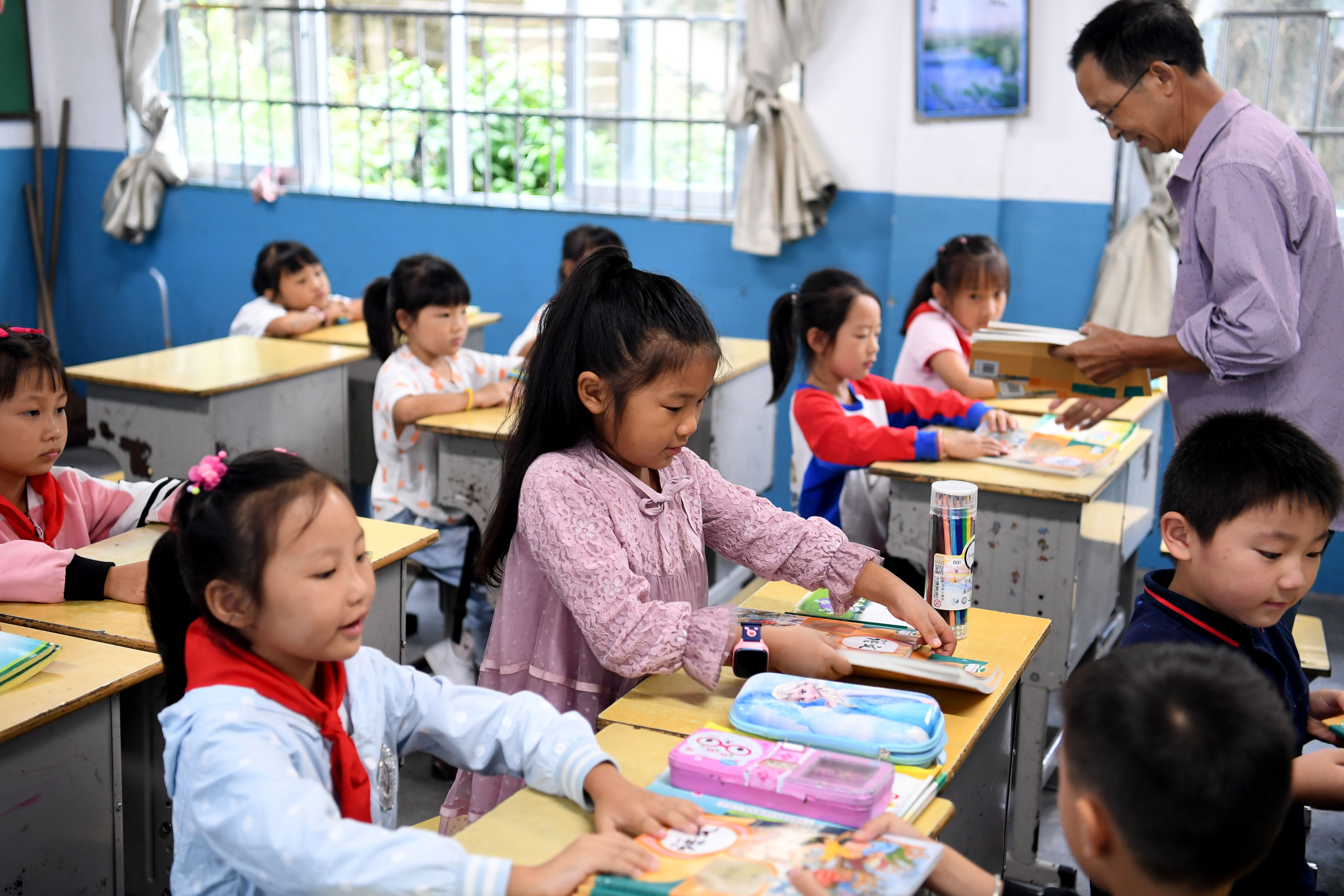 Zhang Qingyu (C) receives her text books at the central primary school of Huangjian in Huangjian Township of east China's Anhui Province, Sept. 1, 2019.(Xinhua/Zhang Duan)