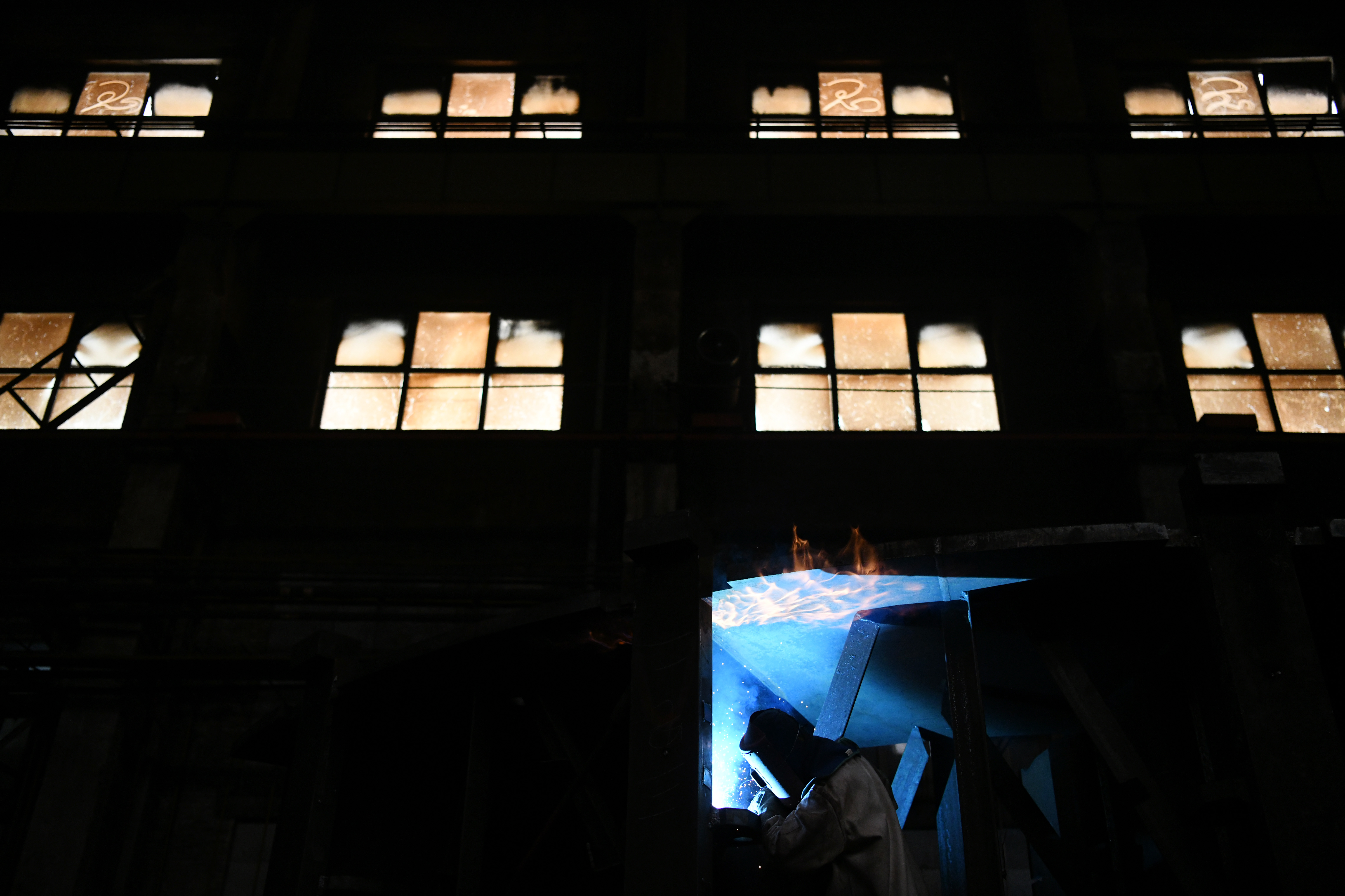 A worker welds components at a factory of Harbin Turbine Company Limited in Harbin, Sept. 3, 2019. (Xinhua/Wang Jianwei)