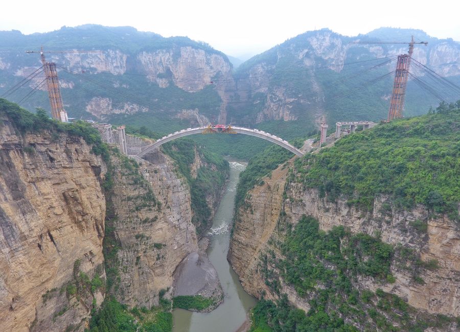 The closure site of the main arch of a bridge is seen in southwest China, July 7, 2019. The bridge is located on the border area of southwest China's Sichuan, Guizhou and Yunnan provinces. Once built, the bridge will solve the traffic difficulties for hundreds of thousands of people living in the border area of the three provinces and make contribution for the poverty alleviation in the Wumeng Mountain area. (Xinhua/Liu Kun)