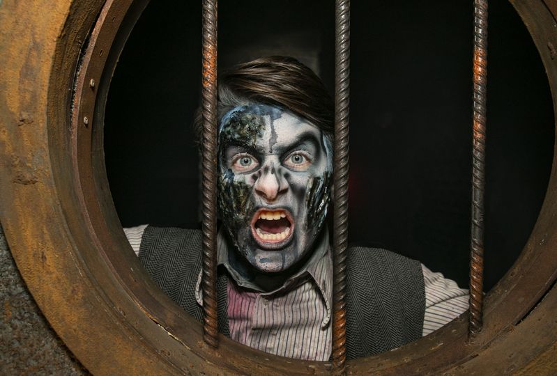 A performer tries to scare tourists at the Hellsgate "Haunted House" in Lockport, Illinois, the United States, on Oct. 20, 2019. Hellsgate "Haunted House" is a Halloween themed tourist facility that offers tourists a terrifying interactive experience during the Halloween festival. (Photo by Joel Lerner/Xinhua)