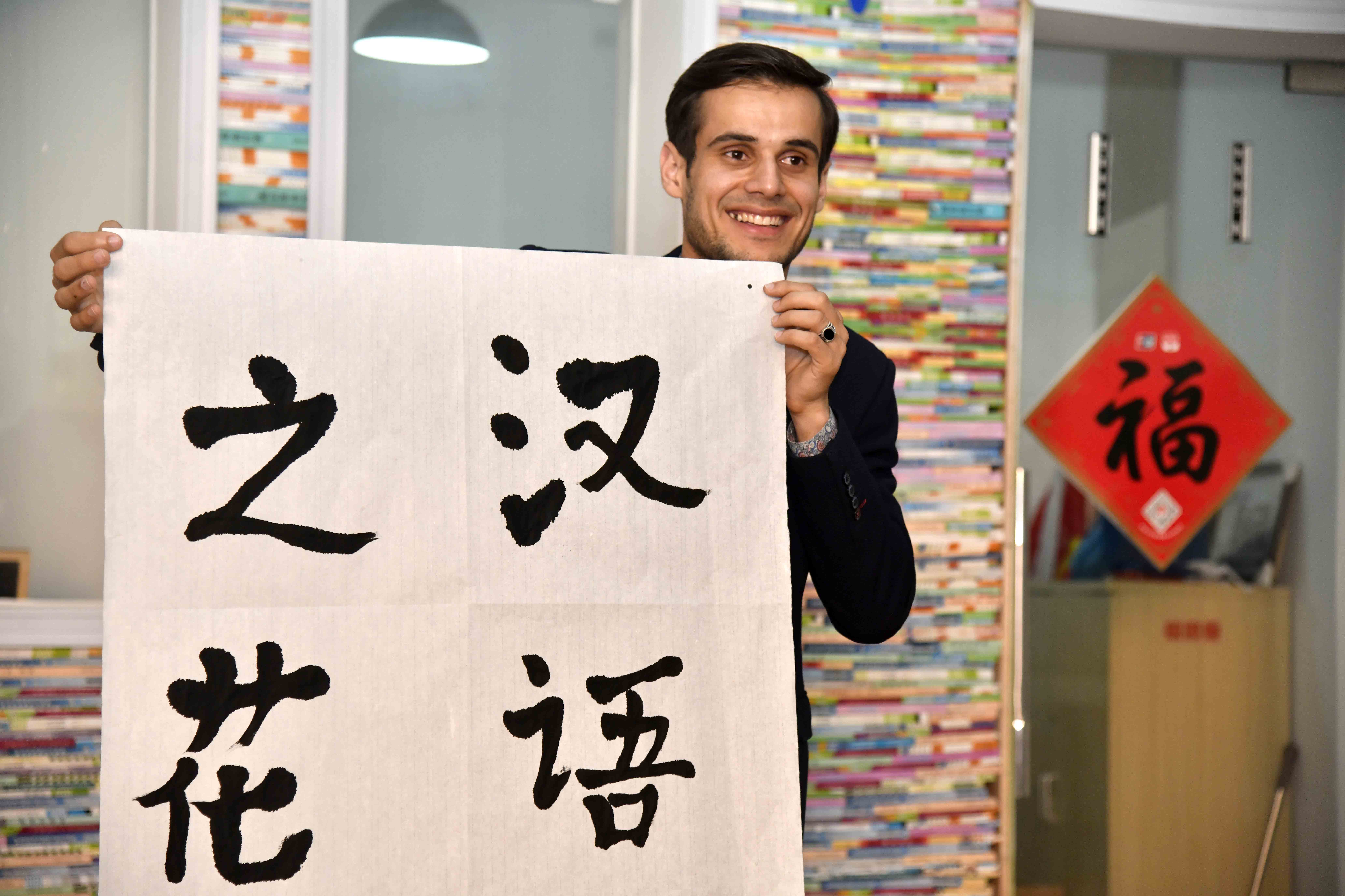 A student from Tajikistan shows his Chinese calligraphy work at the China University of Petroleum in Qingdao, east China's Shandong Province, June 13, 2019. (Xinhua/Guo Xulei)