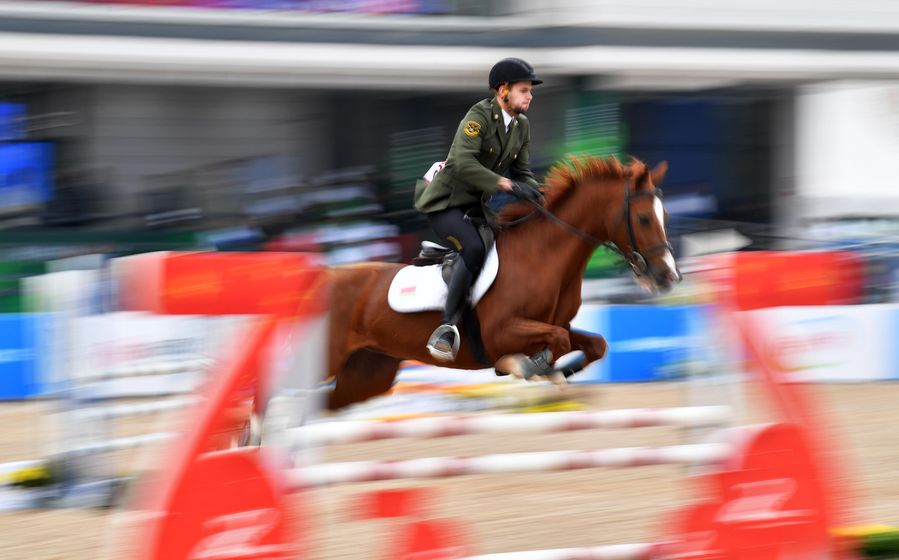 Kasyanik Kirill of Belarus competes during the riding of men's individual of modern pentathlon at the 7th CISM Military World Games in Wuhan, capital of central China's Hubei Province, Oct. 25, 2019. (Xinhua/Li Ga)