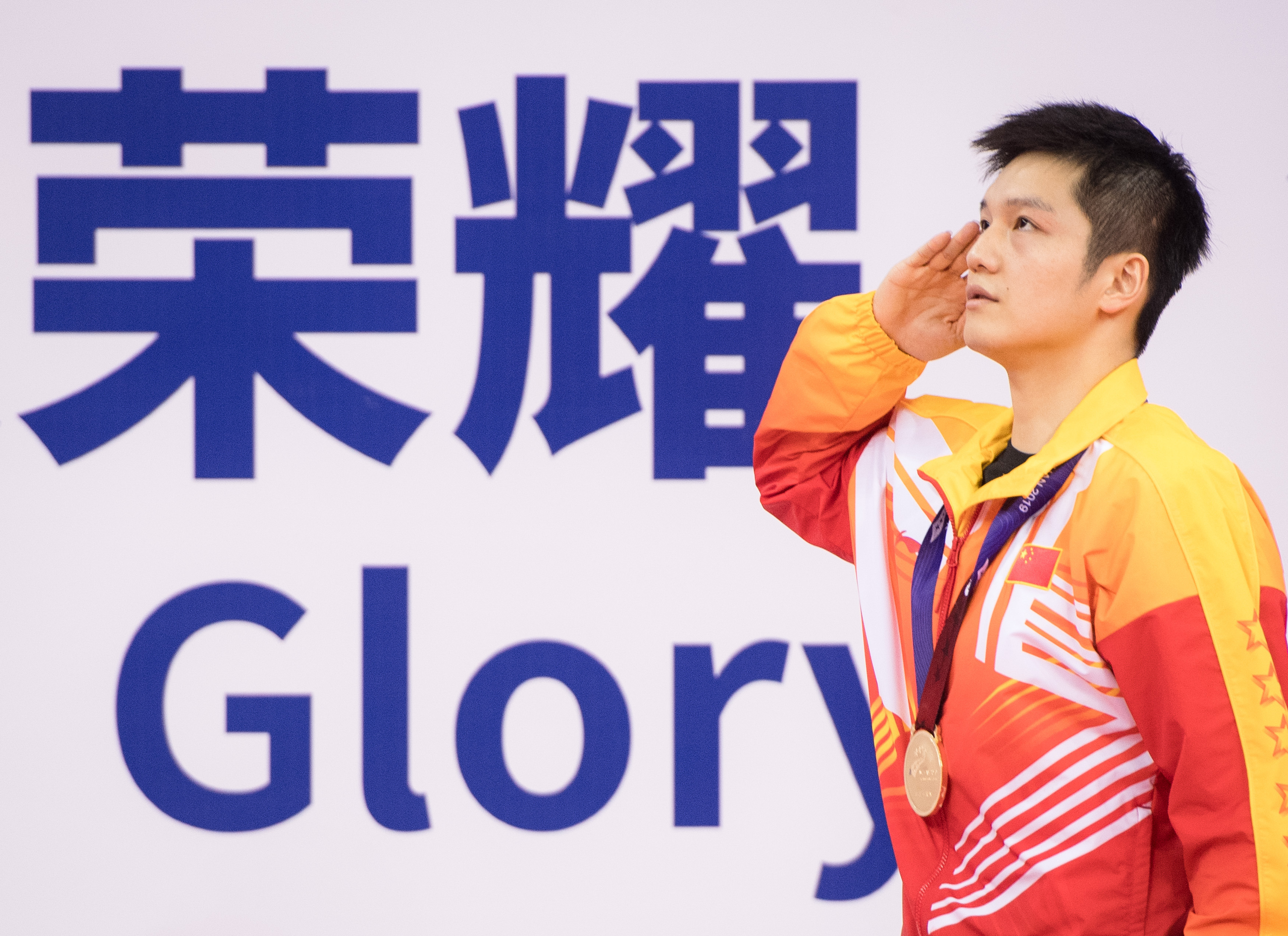 Fan Zhendong of China salutes on the podium after winning the men's singles final match of table tennis against Jeoung Young Sik of South Korea at the 7th CISM Military World Games in Wuhan, capital of central China's Hubei Province, Oct. 26, 2019. (Xinhua/Xiao Yijiu)