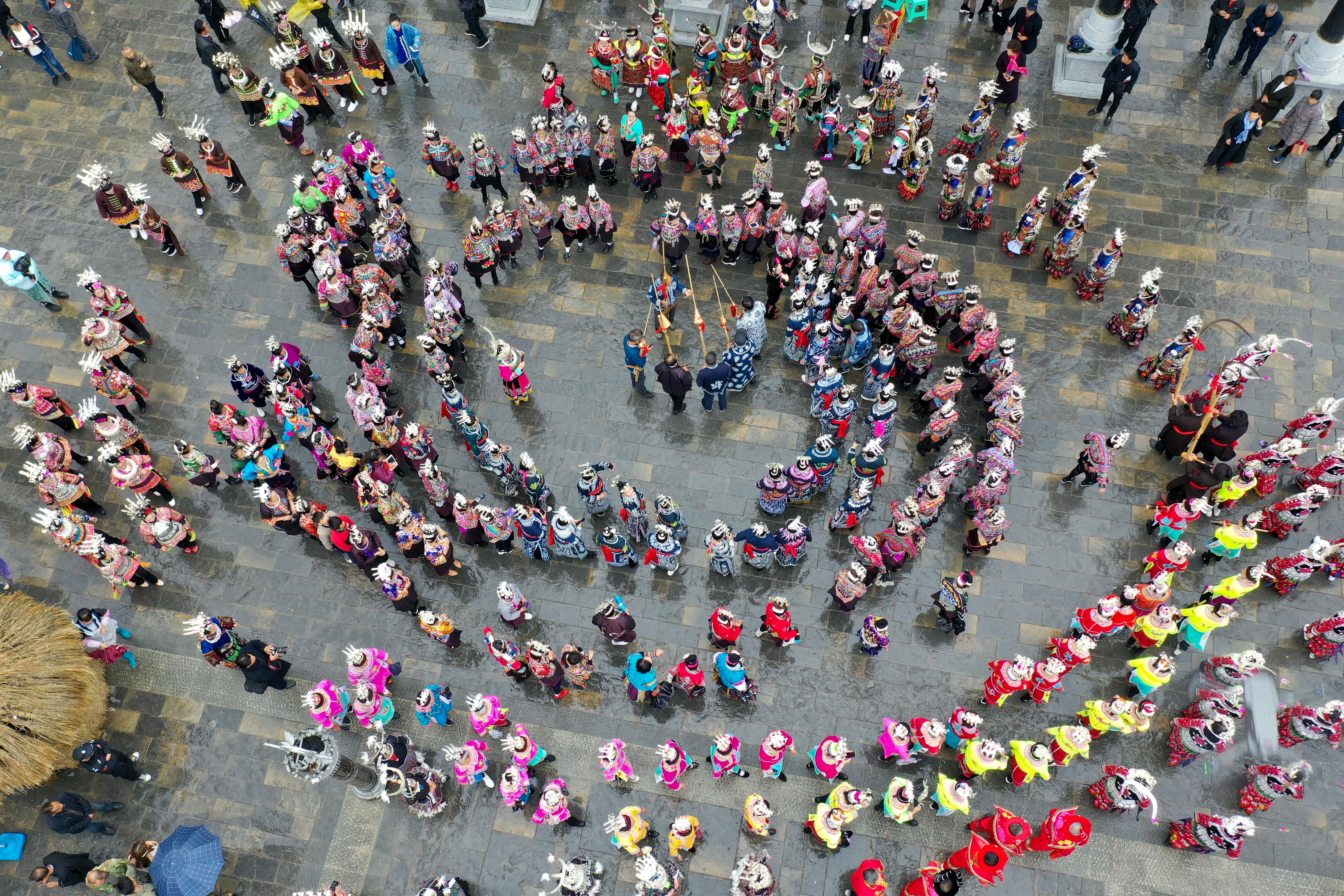 In this aerial photo taken on Oct. 26, 2019, people of the Miao ethnic group perform a dance with Lusheng, a folk musical instrument made of bamboo pipes, in celebration of the "Chixin" festival in Danzhai County, Qiandongnan Miao and Dong Autonomous Prefecture, southwest China's Guizhou Province. (Xinhua/Ou Dongqu)