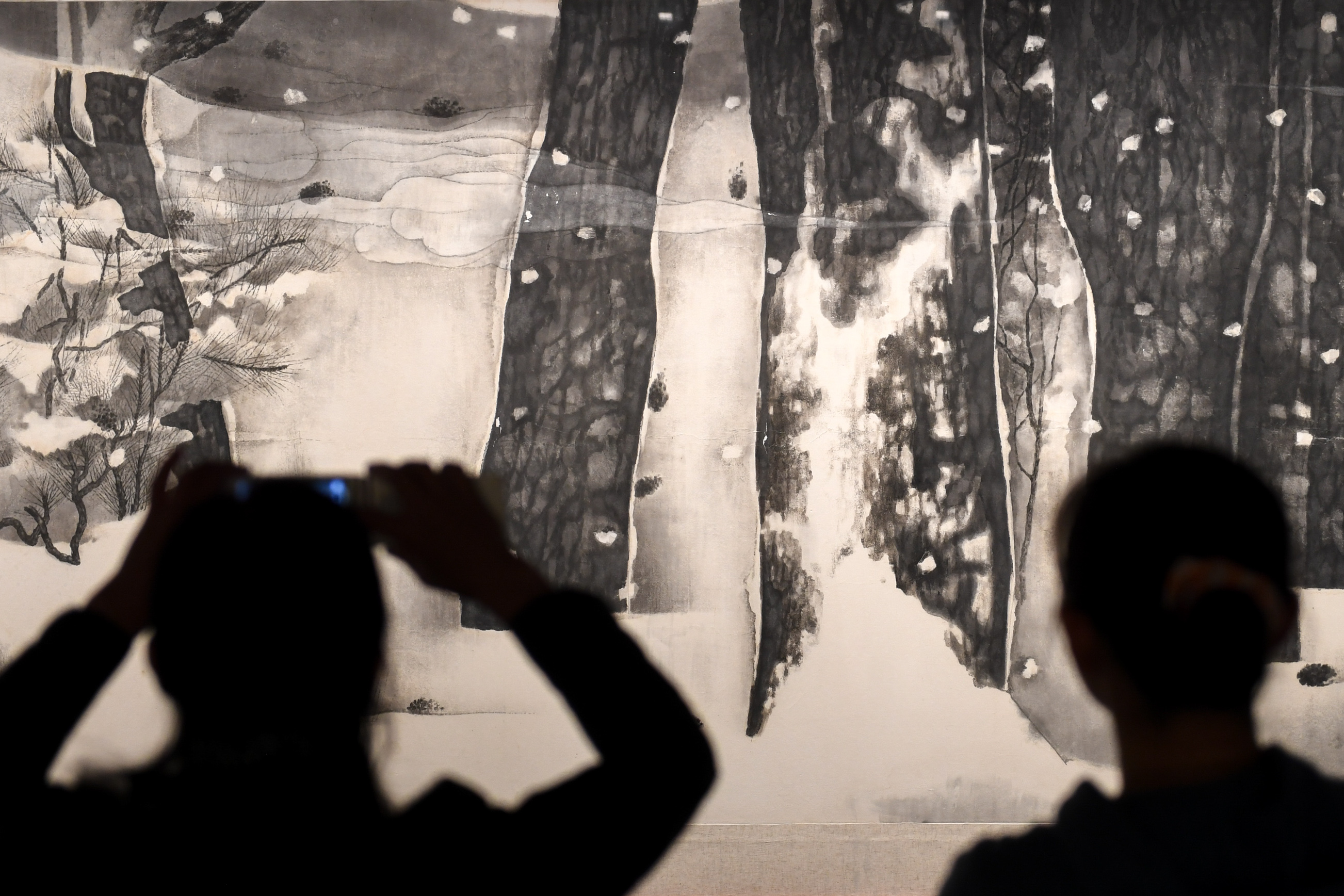Visitors look at an artwork on display during a Chinese painting biennale at Hunan Art Museum in Changsha, capital of central China's Hunan, Oct. 26, 2019. The exhibition will last till Nov. 20 this year, featuring more than 300 artworks. (Xinhua/Chen Zeguo)
