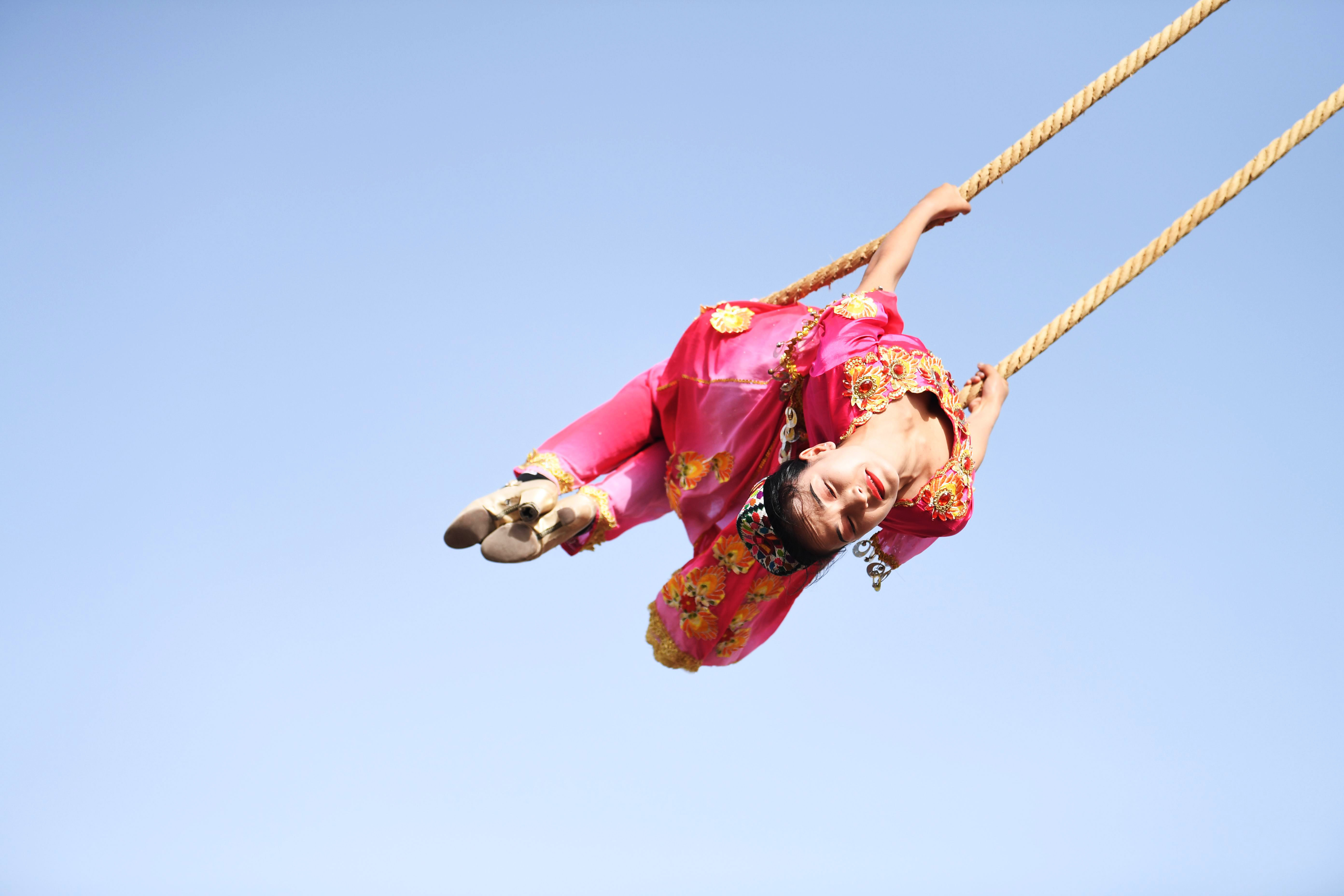 An actress participates in Shaghydi game at Dolan scenic spot of Awat County, northwest China's Xinjiang Uygur Autonomous Region, Oct. 26, 2019. Shaghydi is an ethnic sport game of Uygur people. Players push the bearings around to help people swing on ropes. (Xinhua/Sadat)