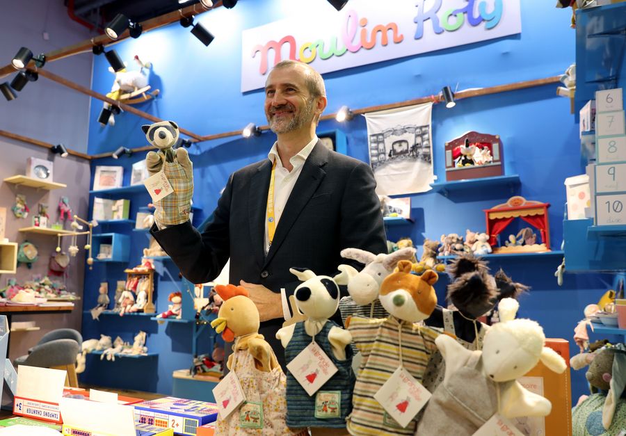 An exhibitor from France shows a toy at the Lifestyles exhibition area during the second China International Import Expo (CIIE) in Shanghai, east China, Nov. 5, 2019. (Xinhua/Liu Ying)