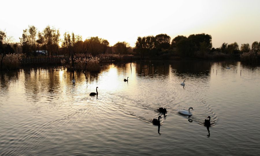 Photo taken on Nov. 18, 2019 shows swans at the Jixi national wetland, located in western Jinan, east China's Shandong Province.(Xinhua/Wang Kai)■
