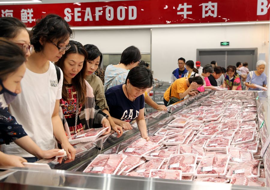 Customers buy fresh pork in a Costco warehouse store in Minhang District, east China's Shanghai, Sept. 19, 2019. (Xinhua/Liu Ying)