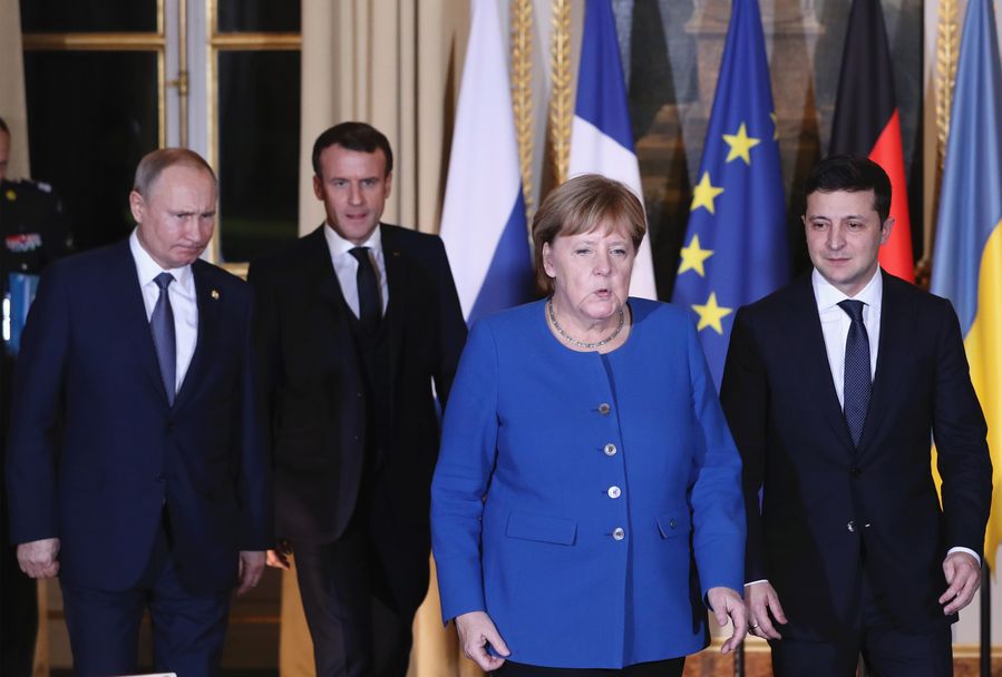 Russian President Vladimir Putin, French President Emmanuel Macron, German Chancellor Angela Merkel and Ukrainian President Volodymyr Zelensky (L to R) attend "Normandy four summit" in Paris, France, Dec. 9, 2019. (Xinhua/Gao Jing)