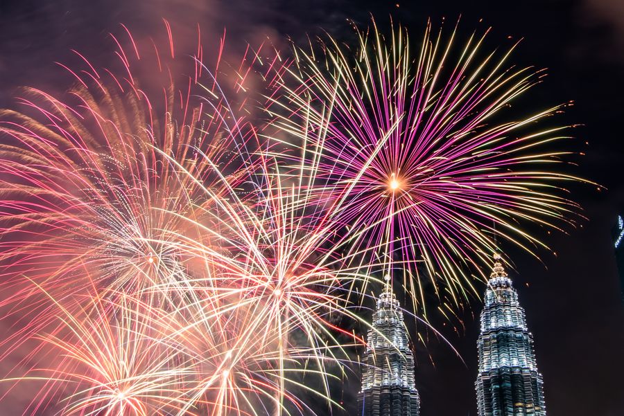 Photo taken on Jan. 1, 2020, shows New Year fireworks explode near the Petronas Twin Towers in Kuala Lumpur, Malaysia. (Xinhua/Zhu Wei)
