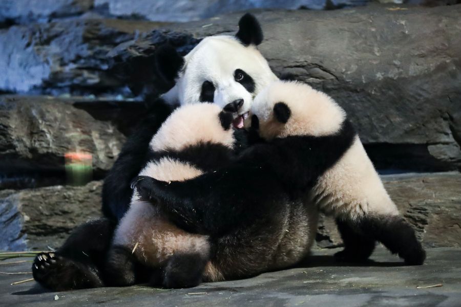 Giant panda Hao Hao plays with her two cubs at the Pairi Daiza zoo in Brugelette, Belgium, Dec. 31, 2019. Giant panda Hao Hao gave birth to twin cubs Bao Di and Bao Mei in August 2019. (Xinhua/Zhang Cheng)
