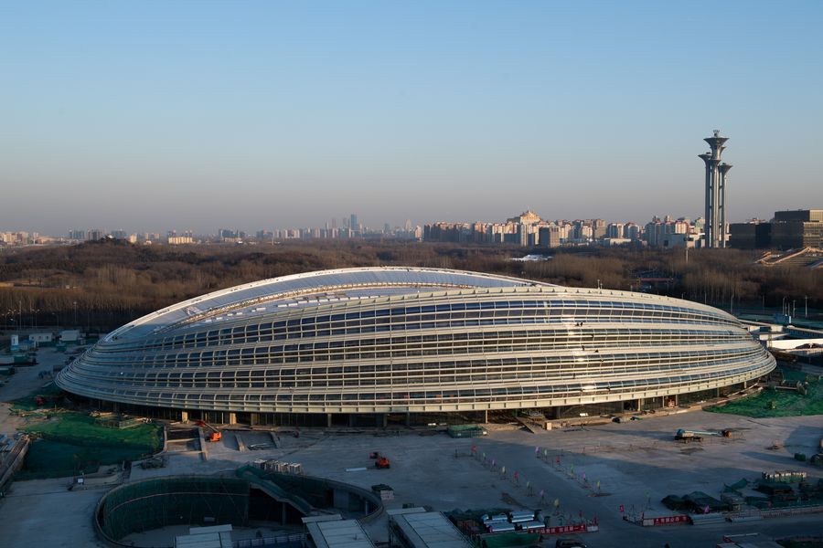 The National Speed Skating Oval, also known as the "Ice Ribbon", in Beijing, Dec. 31, 2019. Construction of the venue is progressing as scheduled. It is expected to host test events in June 2020 for the Beijing 2022 Winter Olympics. (Xinhua/Ju Huanzong)