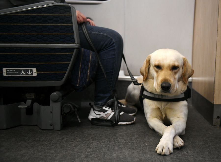 A guide dog waits to board a train at Xi'an North Railway Station in Xi'an, capital of northwest China's Shaanxi Province, Jan. 12, 2020. (Xinhua/Li Yibo)