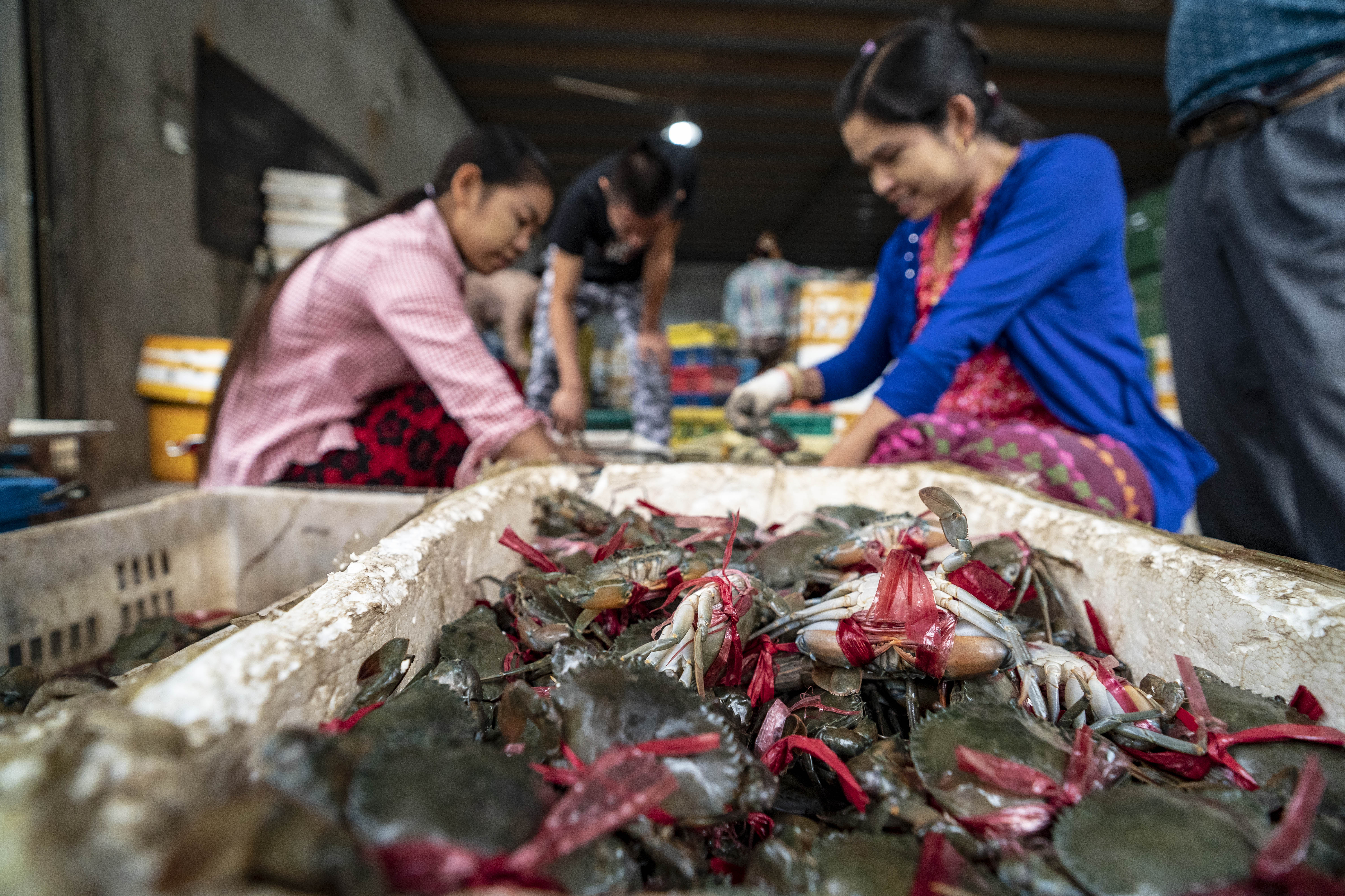 Workers sort crabs imported from Myanmar at a market in Ruili City, southwest China's Yunnan Province, Nov. 5, 2019.(Xinhua/Jiang Wenyao)