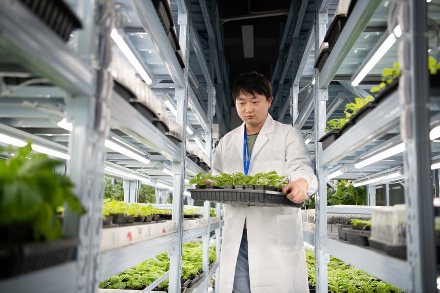 A reseacher checks the growth of seedlings at the laboratory of Magicpen Bio in Hefei, east China's Anhui Province, Dec. 3, 2025. (Xinhua/Zhang Duan)