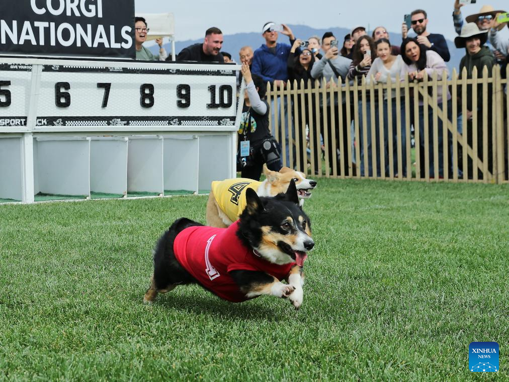 Corgi dogs race during the Winter Corgi Nationals championship at Santa Anita Park in Arcadia, California, the United States, Feb. 15, 2026. (Photo by Qiu Chen/Xinhua)
