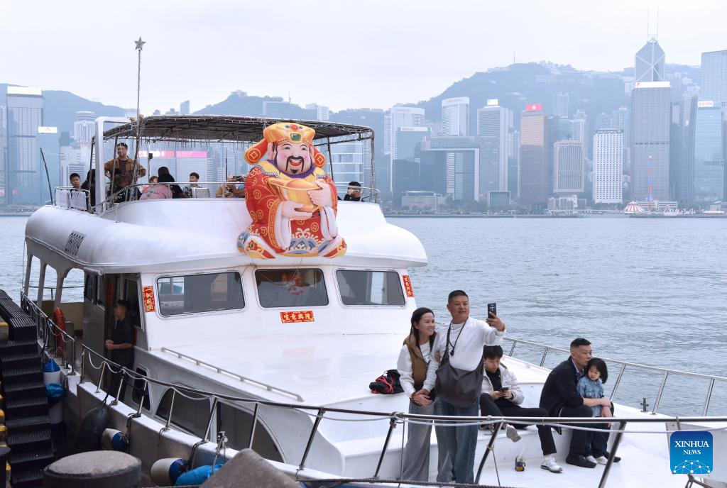 Tourists take a yacht at the Tsim Sha Tsui waterfront in Hong Kong, south China, Feb. 17, 2026. Hong Kong had recorded over 1.16 million visitor arrivals from Feb. 15 to Feb. 20 as many people from the Chinese mainland traveled to the city during the Spring Festival holiday, local data showed on Saturday.