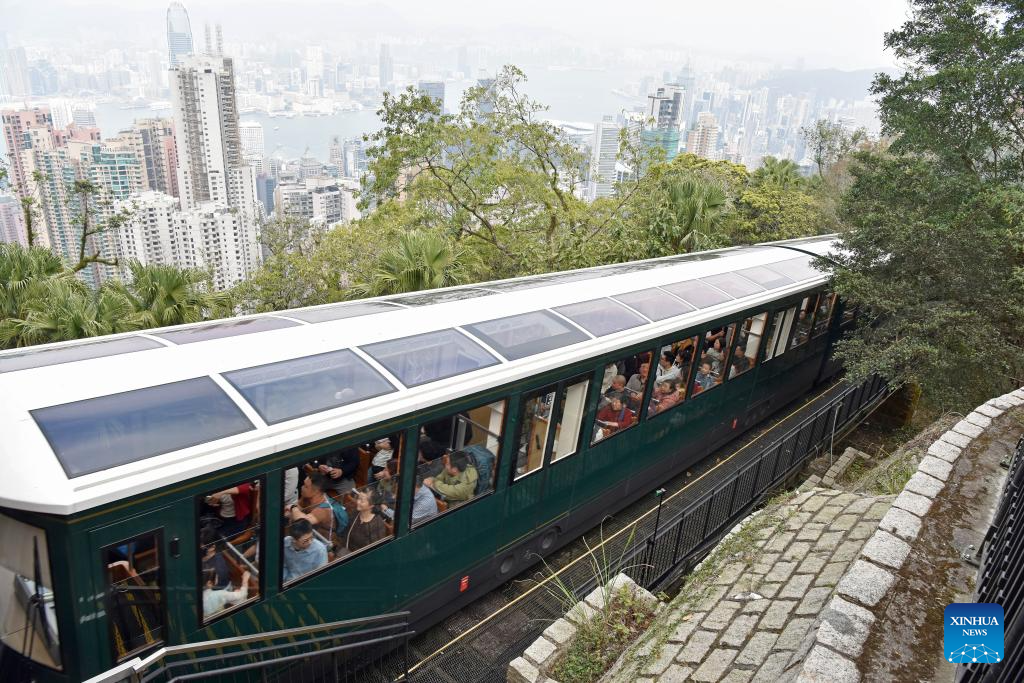 Tourists take a cable car on top of the Victoria Peak, Hong Kong, south China, Feb. 19, 2026. Hong Kong had recorded over 1.16 million visitor arrivals from Feb. 15 to Feb. 20 as many people from the Chinese mainland traveled to the city during the Spring Festival holiday, local data showed on Saturday. Among the total, visits from the mainland topped 980,000, data from the Hong Kong Special Administrative Region government showed. Previous estimates put total mainland tourist arrivals during the nine-day holiday at 1.43 million. (Xinhua/Chen Duo)