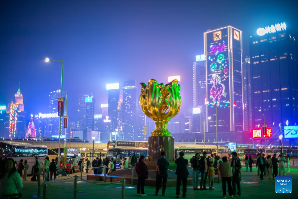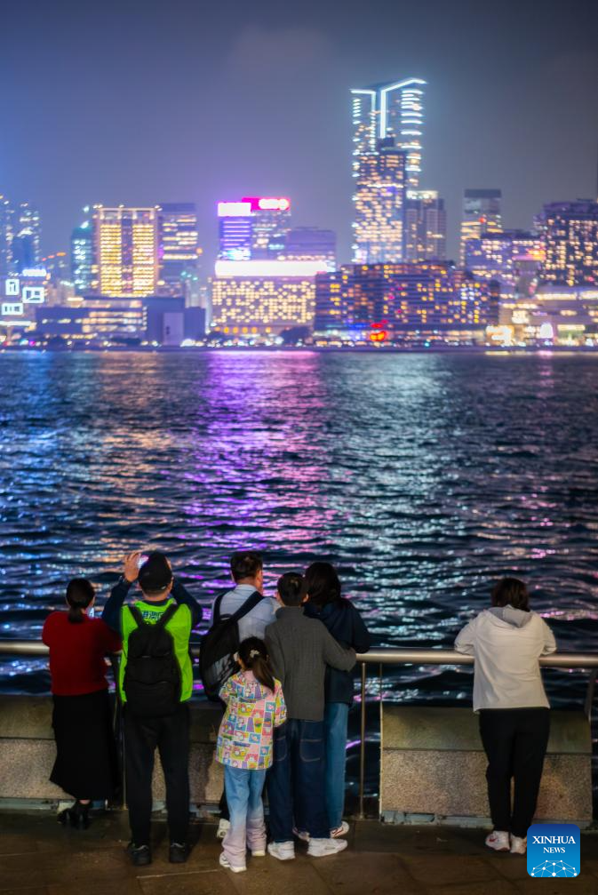 Tourists enjoy a night view at the Wan Chai waterfront in Hong Kong, south China, Feb. 20, 2026. Hong Kong had recorded over 1.16 million visitor arrivals from Feb. 15 to Feb. 20 as many people from the Chinese mainland traveled to the city during the Spring Festival holiday, local data showed on Saturday.