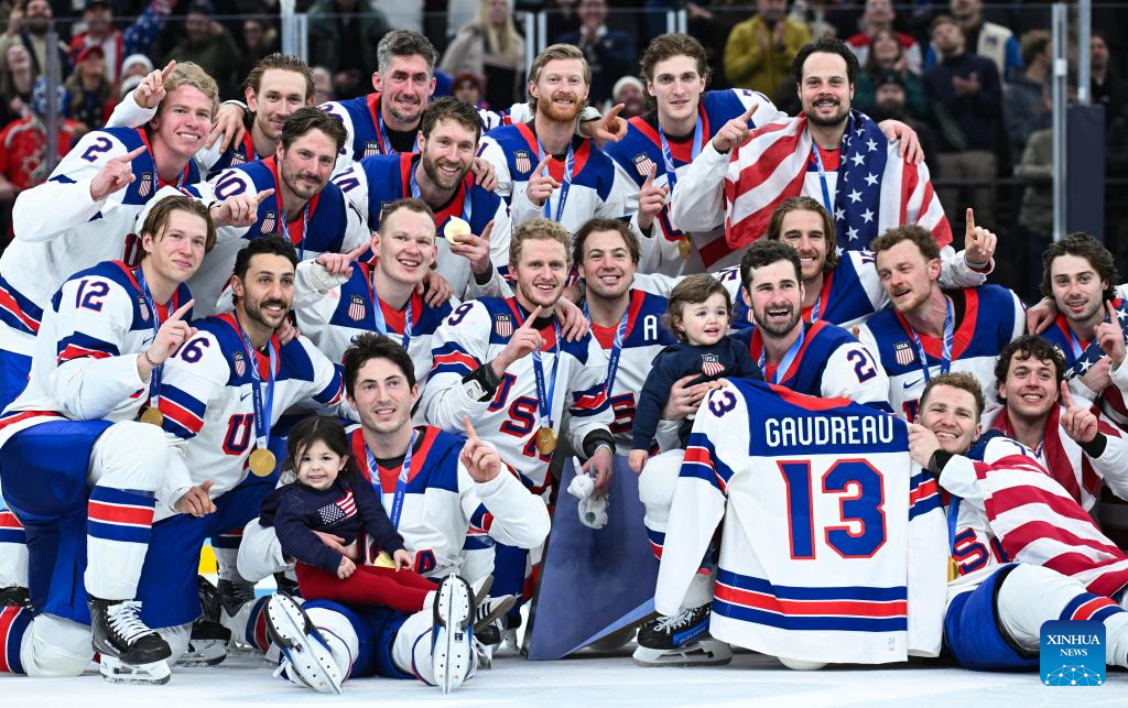 Players of the United States celebrate victory after the ice hockey men's gold medal game between Canada and the United States at the Milan-Cortina 2026 Olympic Winter Games in Milan, Italy, Feb. 22, 2026. (Xinhua/Zhang Haofu)