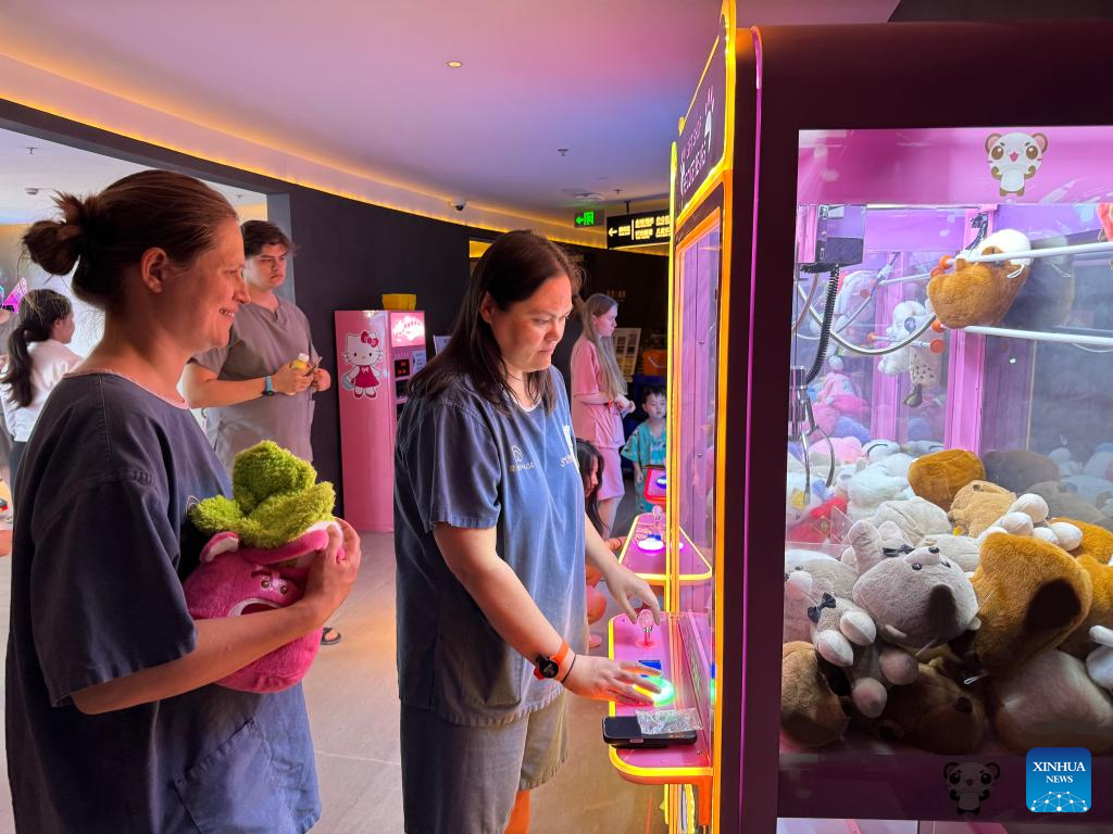 Foreign tourists play with a claw machine at a hot spring resort in Shanghai, east China, April 3, 2026. (Xinhua/Huang Anqi)