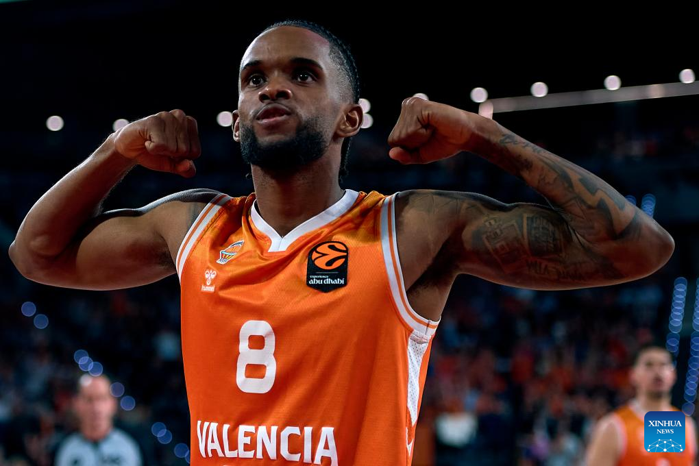 Jean Montero of Valencia celebrates during the Euroleague basketball match between Valencia and Panathinaikos in Valencia, Spain, April 9, 2026. (Photo by Pablo Morano/Xinhua)