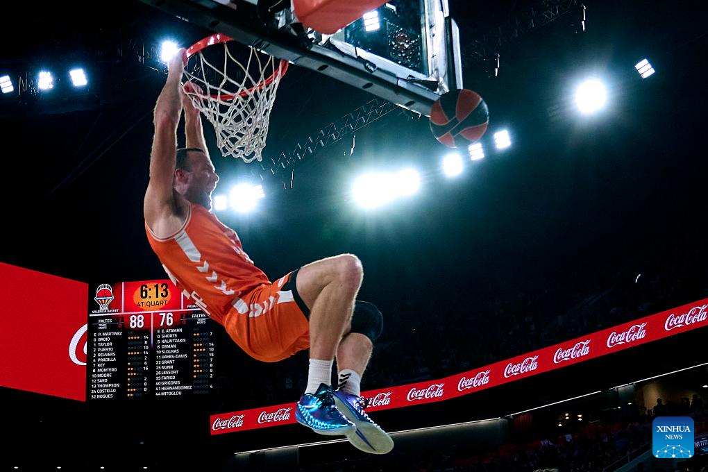 Matt Costello of Valencia dunks during the Euroleague basketball match between Valencia and Panathinaikos in Valencia, Spain, April 9, 2026. (Photo by Pablo Morano/Xinhua)