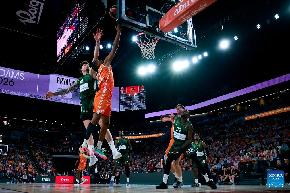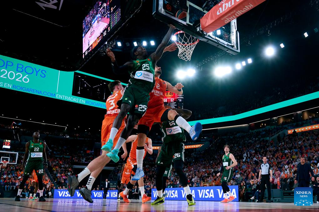 Josep Puerto (3rd L) of Valencia vies for the ball with Kendrick Nunn (2nd L) of Panathinaikos during the Euroleague basketball match between Valencia and Panathinaikos in Valencia, Spain, April 9, 2026. (Photo by Pablo Morano/Xinhua)