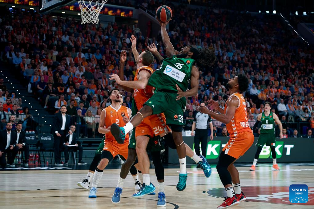 Matt Costello (2nd L) of Valencia vies for the ball with Kenneth Faried (3rd L) of Panathinaikos during the Euroleague basketball match between Valencia and Panathinaikos in Valencia, Spain, April 9, 2026. (Photo by Pablo Morano/Xinhua)