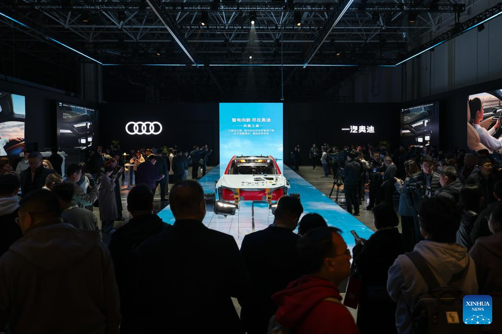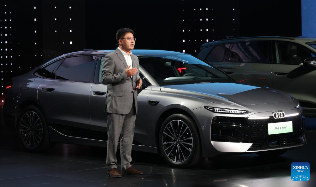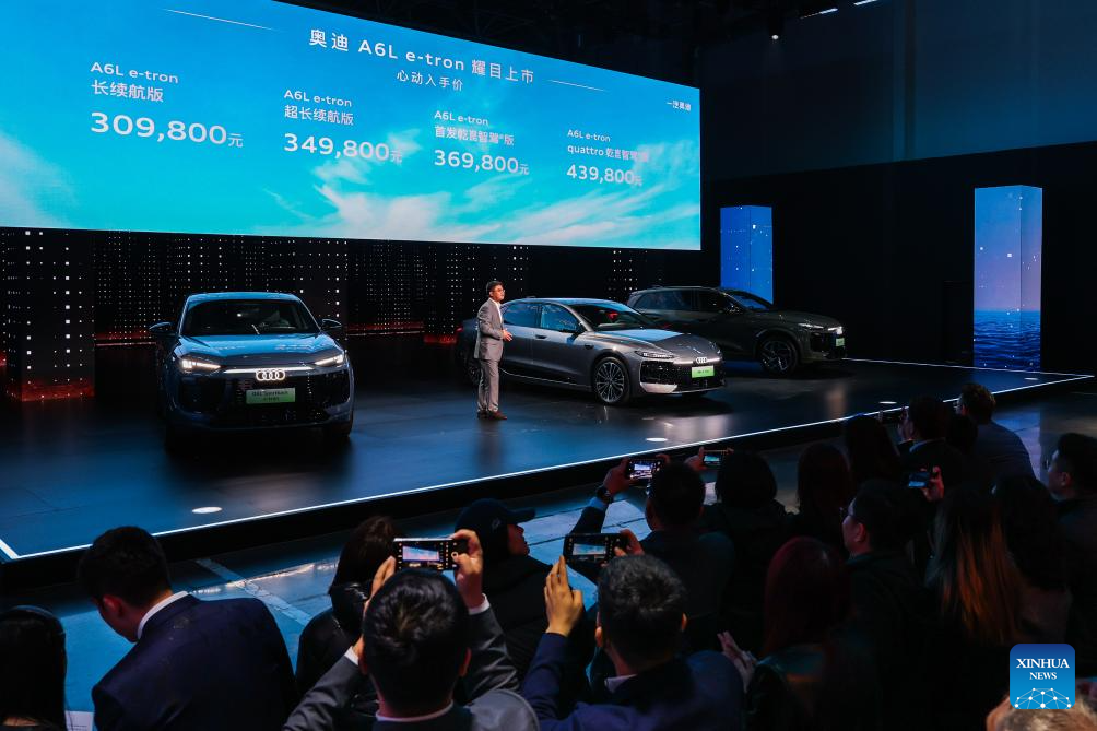 This photo taken on April 10, 2026 shows a launch event for the A6L e-tron, a battery-electric vehicle, making its debut in the Chinese market at Audi FAW NEV Co., Ltd. in Changchun, northeast China's Jilin Province. (Xinhua/Xu Chang)