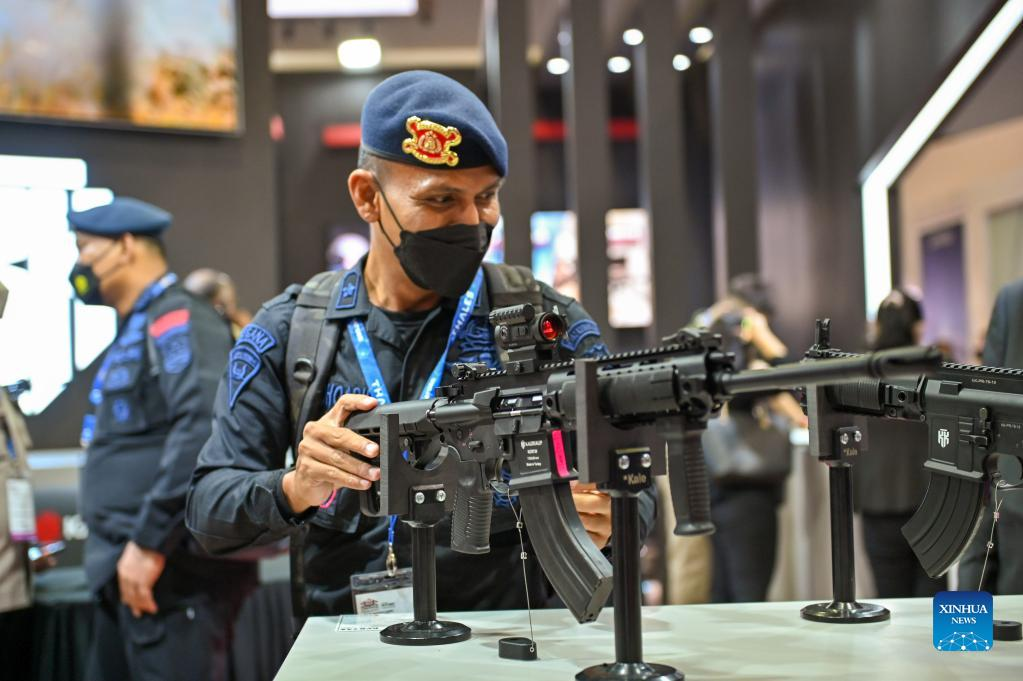 A visitor tries a weapon at Defense Services Asia 2022 in Kuala Lumpur, Malaysia, March 28, 2022. Defense Services Asia 2022, a biennial defense and weaponry show, opened Monday in the Malaysian capital city Kuala Lumpur. About 1,170 companies will be showcasing their products which include military hardware, electronics, cyber security, border protection, recognition and identification, artificial intelligence, battlefield healthcare, training and simulation systems and police equipment, in 20 country pavilions. Among these are more than 20 Chinese defense companies who are displaying the latest products and solutions in their respective fields. (Photo by Chong Voon Chung/Xinhua)