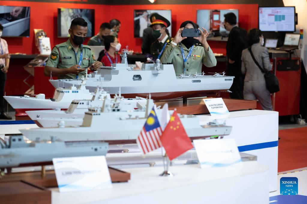 Visitors take photos at the booth of China Shipbuilding Trading Co., Ltd. at Defense Services Asia 2022 in Kuala Lumpur, Malaysia, March 28, 2022. Defense Services Asia 2022, a biennial defense and weaponry show, opened Monday in the Malaysian capital city Kuala Lumpur. About 1,170 companies will be showcasing their products which include military hardware, electronics, cyber security, border protection, recognition and identification, artificial intelligence, battlefield healthcare, training and simulation systems and police equipment, in 20 country pavilions. Among these are more than 20 Chinese defense companies who are displaying the latest products and solutions in their respective fields. (Xinhua/Zhu Wei)