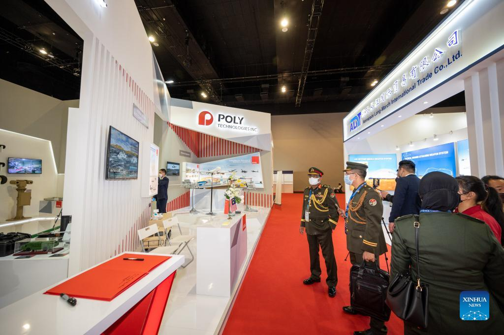 Visitors look at the booth of China's Poly Technologies Inc. at Defense Services Asia 2022 in Kuala Lumpur, Malaysia, March 28, 2022. Defense Services Asia 2022, a biennial defense and weaponry show, opened Monday in the Malaysian capital city Kuala Lumpur. About 1,170 companies will be showcasing their products which include military hardware, electronics, cyber security, border protection, recognition and identification, artificial intelligence, battlefield healthcare, training and simulation systems and police equipment, in 20 country pavilions. Among these are more than 20 Chinese defense companies who are displaying the latest products and solutions in their respective fields. (Xinhua/Zhu Wei)