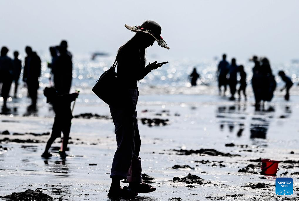 Tourists enjoy their leisure time on a beach in Fangchenggang, south China's Guangxi Zhuang Autonomous Region, Feb. 20, 2026. On the fourth day of the Chinese New Year, many tourists flocked into the beach here to celebrate the festival. (Xinhua/Zhang Ailin)