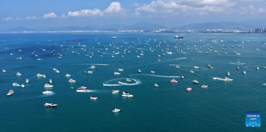 A drone photo taken on Feb. 21, 2026 shows tourists taking yachts in Sanya, south China's Hainan Province. During the first Spring Festival holiday since the launch of island-wide special customs operations in China's Hainan Free Trade Port (FTP), the southern tropical island has become a popular destination for yachting. According to data, over 7,000 yacht voyages were made in Sanya in the first six days of the Spring Festival holiday. (Xinhua/Zhao Yingquan)