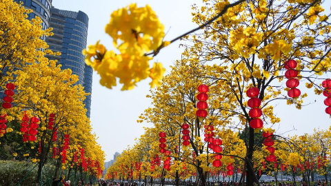 People enjoy tabebuia chrysantha blossoms in Guangzhou, China's Guangdong