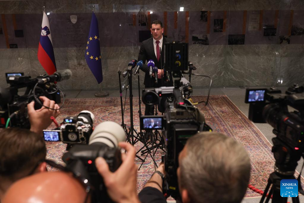 Zoran Stevanovic answers the questions to the media after the first session of the new Slovenian parliament in Ljubljana, Slovenia, April 10, 2026. Stevanovic, leader of the center-right party Resni.ca, was elected speaker of the Slovenia's parliament, which was inaugurated on Friday. (Photo by Zeljko Stevanic/Xinhua)