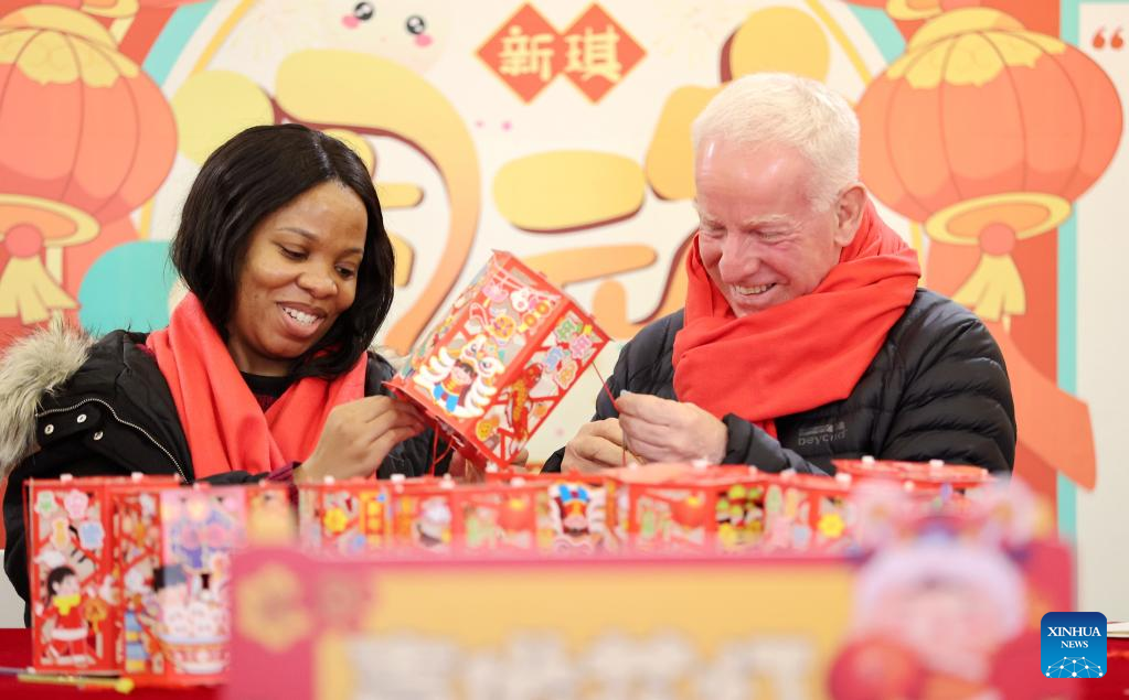 Foreigners make lanterns in Xinqi Village of Deqing County, Huzhou City, east China's Zhejiang Province, Feb. 13, 2022. Various events are held across China to celebrate the upcoming Lantern Festival. (Photo by Xie Shangguo/Xinhua)