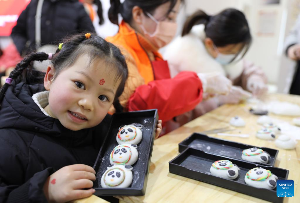 People make Tangyuan, a kind of round and sweet dumpling made of glutinous rice flour, in shape of Bing Dwen Dwen, a panda mascot for the 2022 Games, at a community in Wuhu City, east China's Anhui Province, Feb. 13, 2022. Various events are held across China to celebrate the upcoming Lantern Festival. (Photo by Yang Hua/Xinhua)