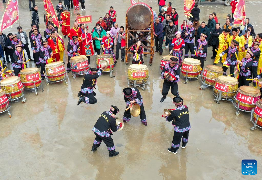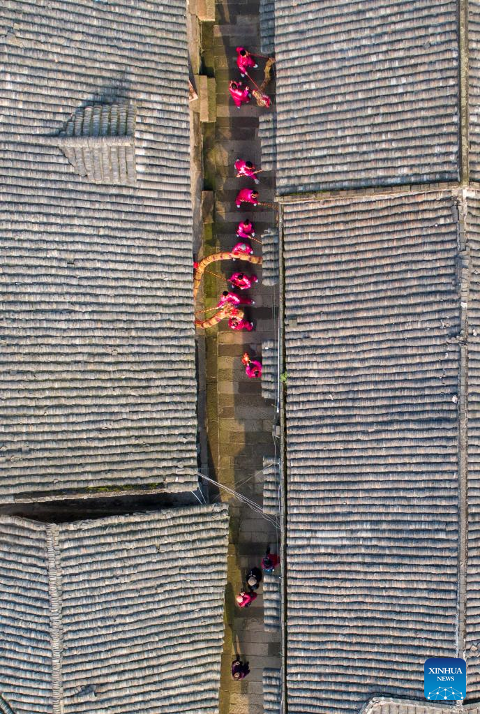 Aerial photo taken on Feb. 13, 2022 shows folk artists performing at Zhouping Village in Zhuxi Township of Cengong County, southwest China's Guizhou Province. Various events are held across China to celebrate the upcoming Lantern Festival. (Photo by Hu Panxue/Xinhua)