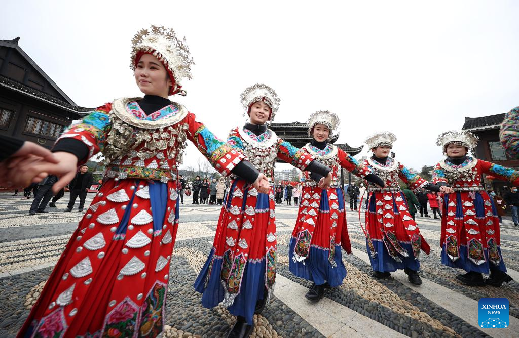 Tourists dance with people of Miao ethnic group at Wanda Town of Danzhai County in Qiandongnan Miao and Dong Autonomous Prefecture, southwest China's Guizhou Province, Feb. 13, 2022. Various events are held across China to celebrate the upcoming Lantern Festival. (Photo by Huang Xiaohai/Xinhua)