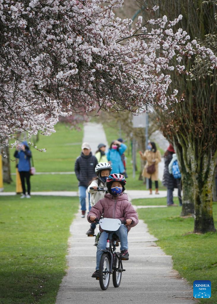 People spend their time under cherry blossoms in Vancouver, British Columbia, Canada, on March 24, 2022. There are approximately 43,000 cherry trees in Metro Vancouver. (Photo by Liang Sen/Xinhua)