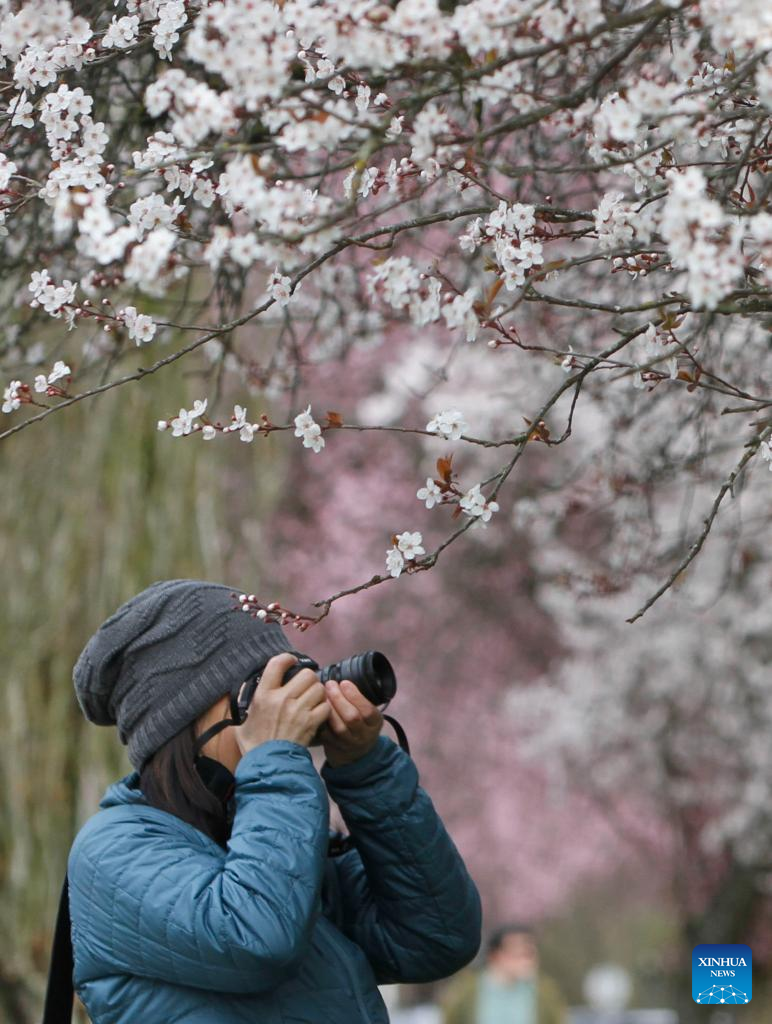 A visitor takes photos of cherry blossoms in Vancouver, British Columbia, Canada, on March 24, 2022. There are approximately 43,000 cherry trees in Metro Vancouver. (Photo by Liang Sen/Xinhua)