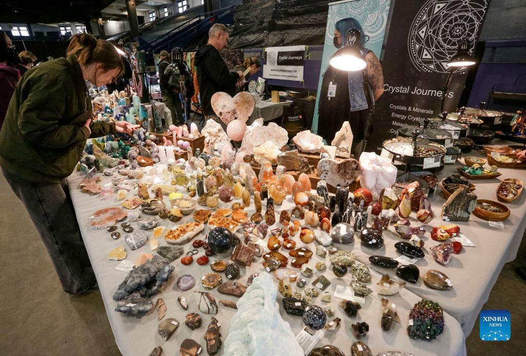 People look at gemstones displayed at a booth while visiting the Gem and Mineral Show in Vancouver, British Columbia, Canada, on March 25, 2022. The three-day show features about 100 vendors from across Canada with their gem, mineral and rare fossil collections. (Photo by Liang Sen/Xinhua)