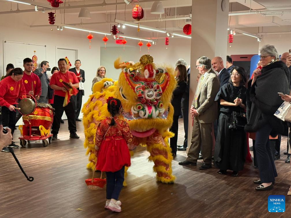 A guest interacts with a dancing lion before a Chinese New Year banquet held in Lower Manhattan, New York City, the United States, on Feb. 9, 2026. (Photo by Vivien Liu/Xinhua)