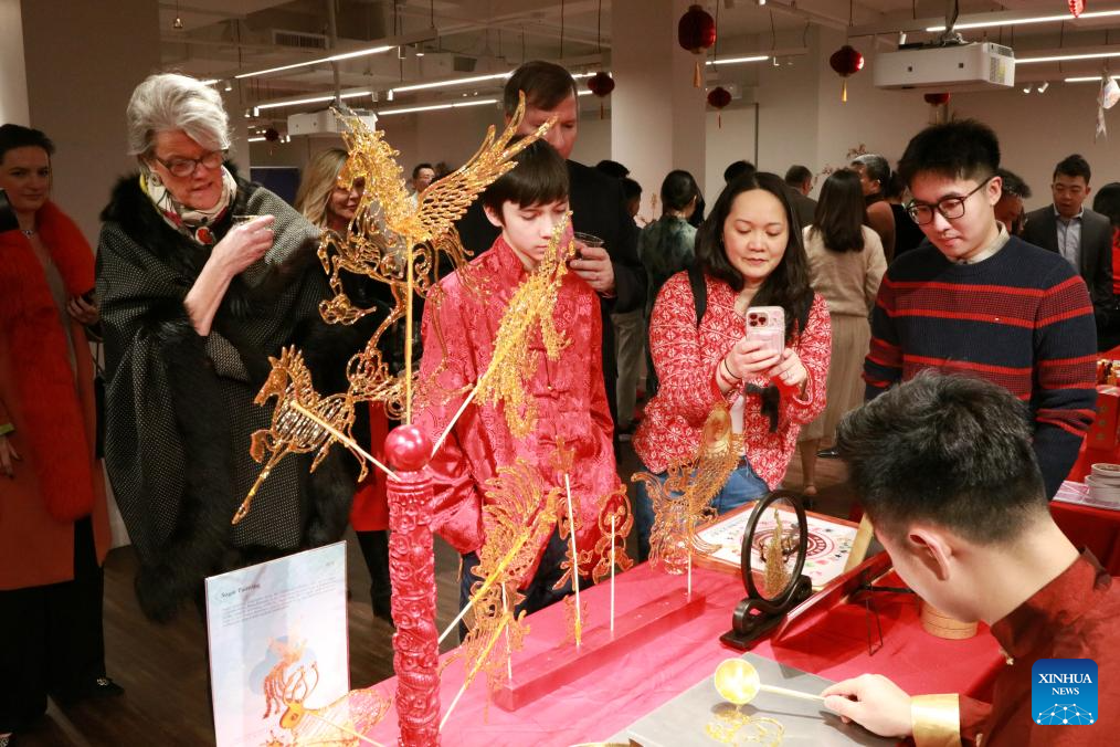 Guests view traditional Chinese artifacts before a Chinese New Year banquet held in Lower Manhattan, New York City, the United States, on Feb. 9, 2026. (Photo by Vivien Liu/Xinhua)