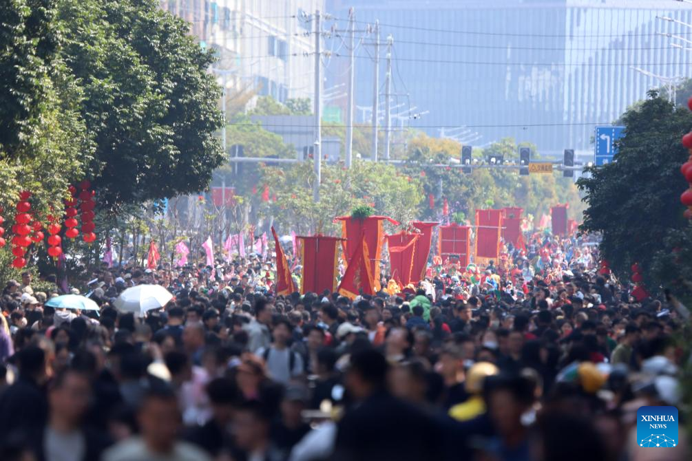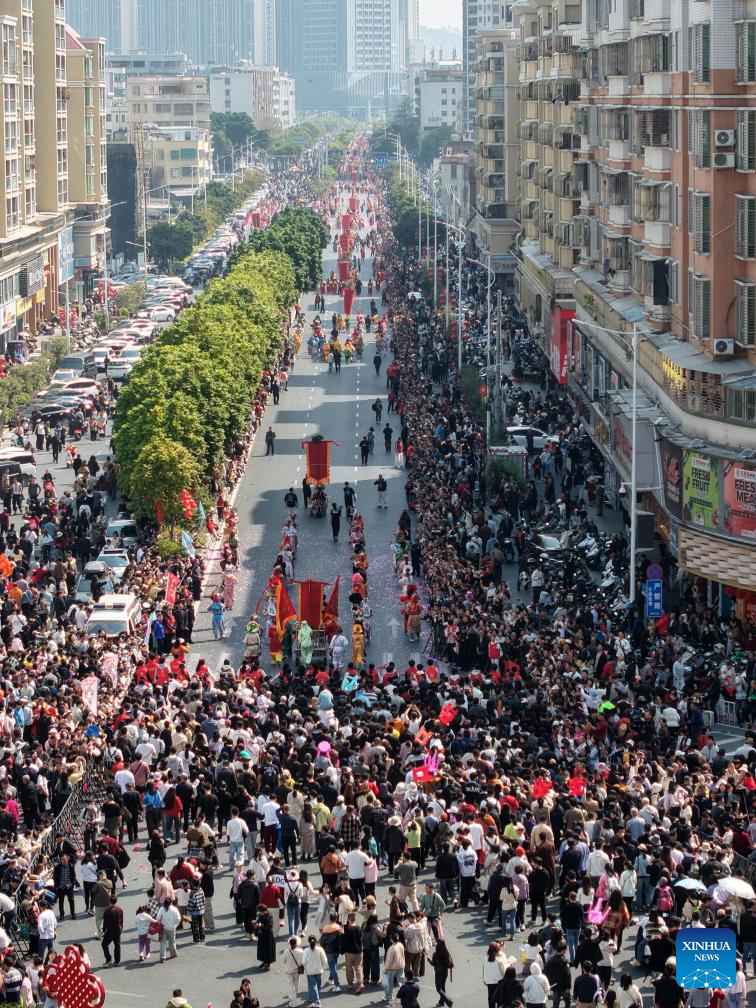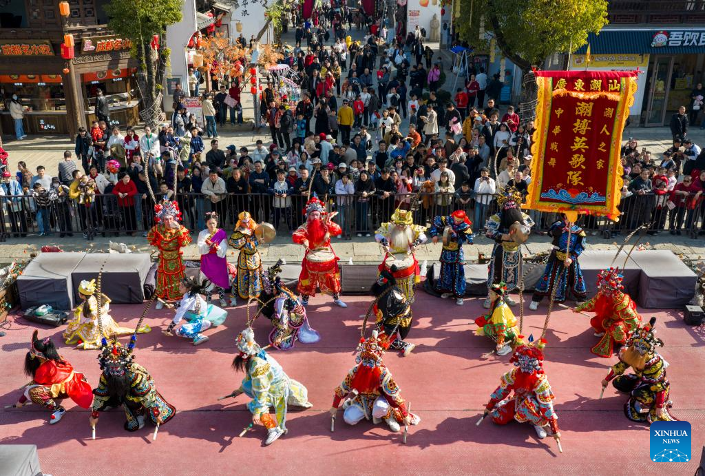 A drone photo taken on Feb. 21, 2026 shows people enjoying performances during a Yingge dance carnival event celebrating the Spring Festival in Chaoyang District of Shantou, south China's Guangdong Province. During the Spring Festival holiday, many Yingge dance teams have staged wonderful performances across China.